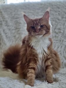 Jest dużą, masywną kotką, z piękną głową o intensywnym spojrzeniu żółtych oczu. Cudownie wyróżniają się jej białe skarpetki i krawatka na tle rudego, pręgowanego futra.
